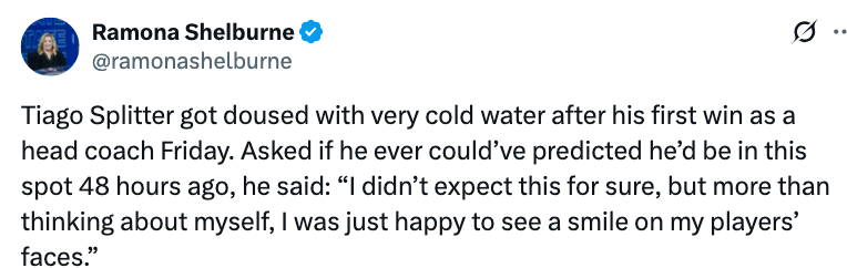 开拓者全队在赛后朝斯普利特泼水以庆祝其指教生涯首胜,斯普利特打趣表示:“非常冰的水,我全身都湿了。”当被问及是否曾预料到48小时前自己会处于这个(主帅)位置时,他表示:“我确实没预料到,但比起考虑自己,我更开心的是看到球员们脸上的笑容。”