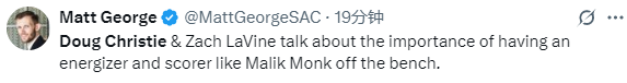 2025-10-25 14:10北京时间10月25日,NBA常规赛继续进行,国王105-104战胜爵士。本场比赛中,国王球员马利克-蒙克出战20分钟,14投7中,三分9中6得到20分1篮板3助攻2抢断2盖帽。赛后,主帅克里斯蒂在接受采访时谈及他的表现。