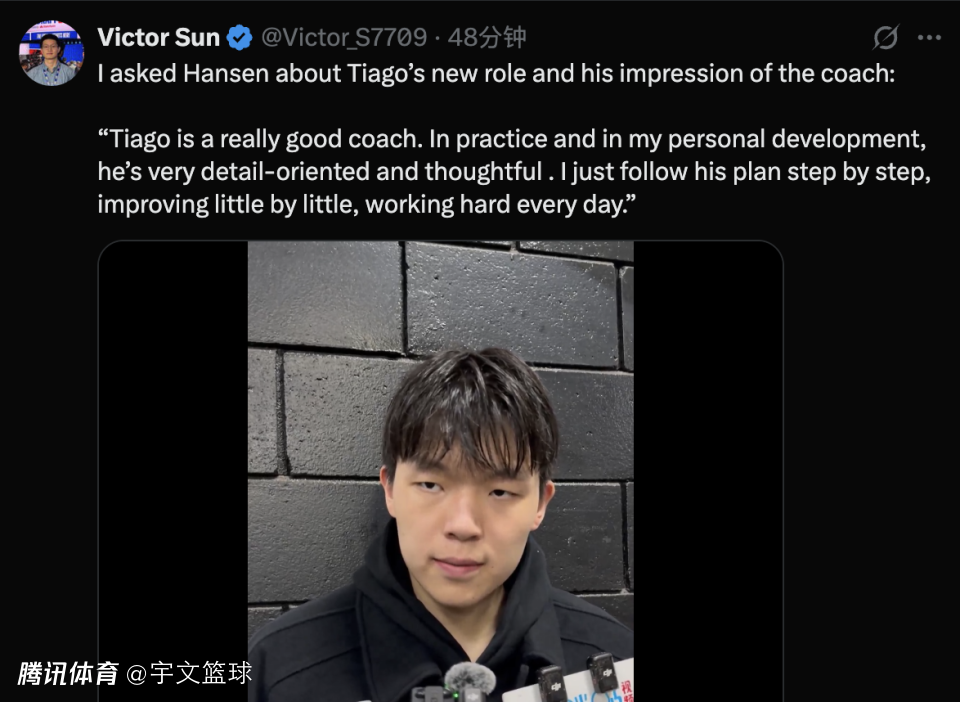 杨瀚森在赛后采访中也谈到了斯普利特,杨瀚森表示“蒂亚戈(斯普利特)真的是一位很棒的教练,无论是在训练中还是在我的个人发展中,他都非常注重细节,考虑周到。我只是一步一步地按照他的计划,一点一点地进步,每天都努力训练”。