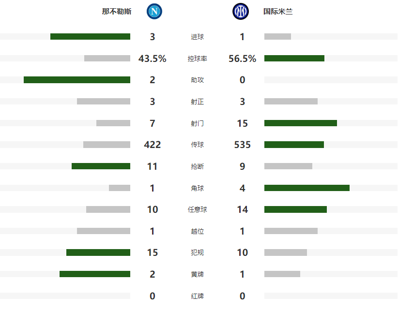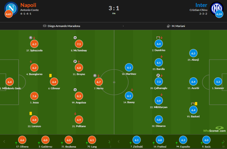 本场比赛那不勒斯在主场踢出了更加高效的进攻,靠着德布劳内的点射,以及麦克托米奈和安古伊萨的进球,3-1击败了国际米兰,终结两连败的同时,超越AC米兰,坐上了意甲积分榜第一的宝座。