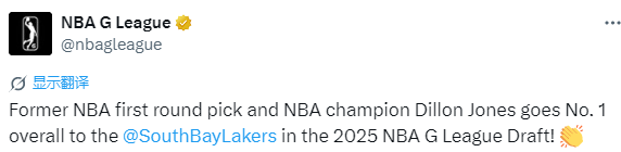 2024年NBA选秀首轮秀狄龙-琼斯在本次G联盟选秀中被洛杉矶湖人队的下属发展联盟球队南湾湖人队以状元签选中。