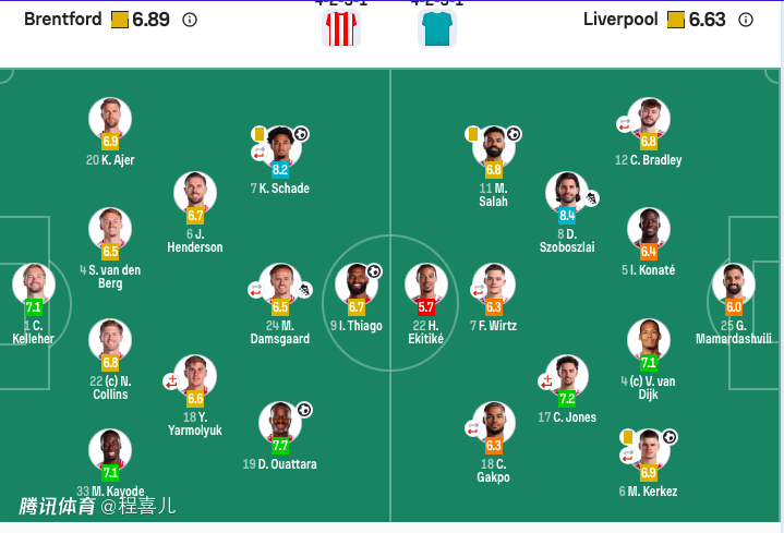 布伦特福德首发:1-凯莱赫、20-阿耶尔、9-伊戈尔·蒂亚戈。