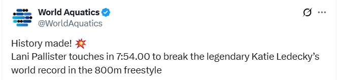 在接下来的200米赛程中,帕利斯特稳步扩大优势,仅第三段200米就又比莱德基的纪录快了1秒。本周这位澳大利亚选手的状态毫无下滑,全程保持高速游进,最终以惊艳的7分54秒00触壁。这一成绩将莱德基的世界纪录缩短3.42秒,同时比历史第三快选手米雷娅-贝尔蒙特快超5秒。
