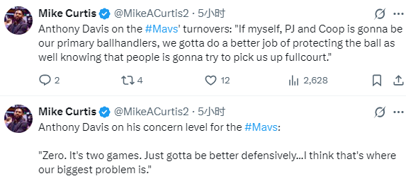 当被问及对独行侠队的担忧程度时,安东尼-戴维斯表示:“零担忧。这才打了两场比赛而已。我们只需要在防守端做得更好,我认为防守就是我们目前最大的问题所在。”
