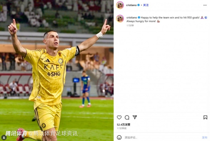 而C罗也在赛后通过社媒晒出自己的庆祝照,并配文:“很高兴帮助球队获胜并且达成950球里程碑!永远渴望更多!”