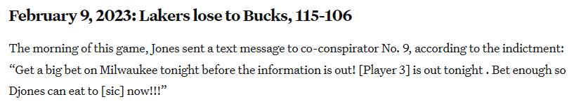 起诉书显示,比赛当天早晨,琼斯便给同谋发去短信,怂恿对方“在消息公开前赶紧重注雄鹿!詹姆斯今晚缺阵,下足够注码,好让我(琼斯)能捞一笔!”