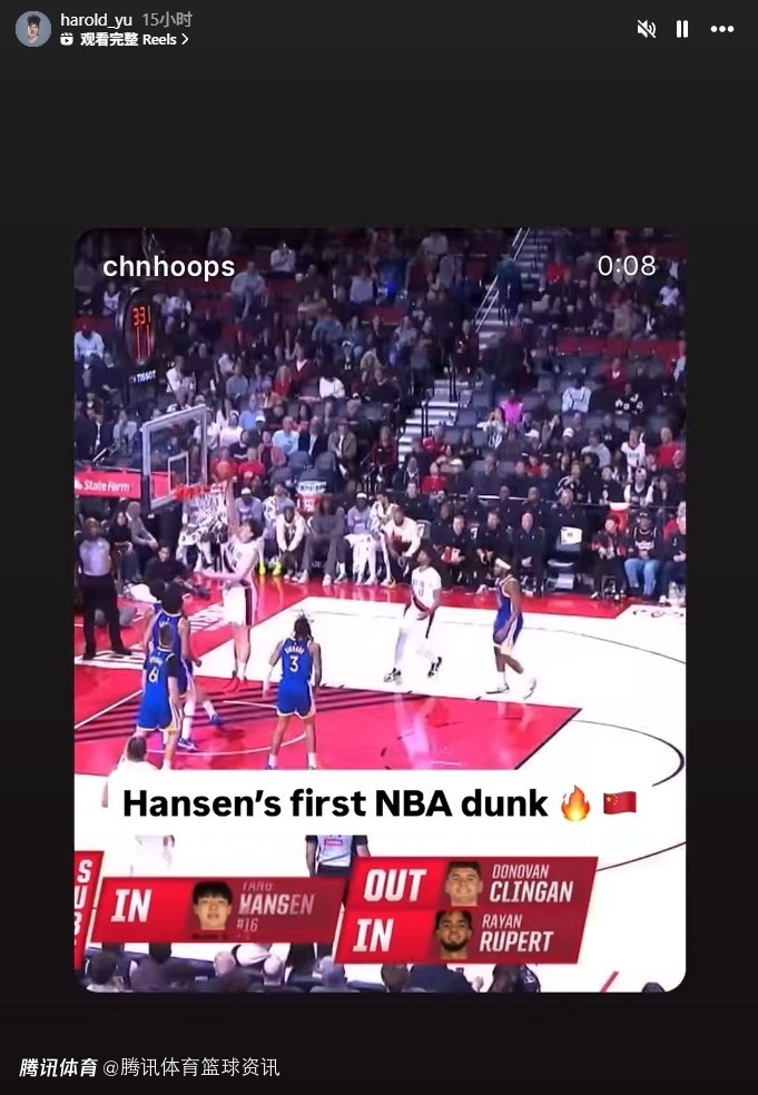 值得一提的是,余嘉豪在自己征战国外联赛期间,还在关注杨瀚森的表现,此前他曾在社交媒体上转发杨瀚森在NBA生涯的首次扣篮。