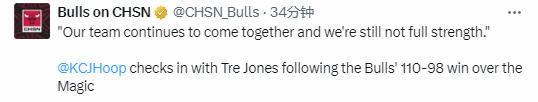 在谈到帕特里克-威廉姆斯的表现时,琼斯说道:“我们都清楚,没有哪一名球员能独自扛起所有责任,他是我们今晚的关键得分点,所以我们必须团结协作。他在整个季前赛、训练营中都是球队的核心,总能在关键时刻挺身而出。就像你说的,帕特里克在关键时刻发挥了重要作用,我们的整个替补席都各司其职,持续带来贡献。不过我们还有很长的路要走,今晚先拿下一场胜利,好好享受这一刻吧。”