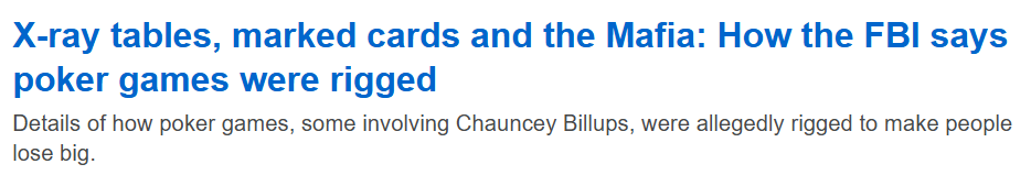 比卢普斯和琼斯参与的游戏也是同样的操作逻辑,不过由于他们的名人身份,其中还有一些细微差别。在2019年4月的一场游戏中,被告人索菲亚在群里发消息称,比卢普斯和被告人欧内斯特在对阵同一名玩家时赢了两手不太可能赢的牌。斯特劳德回复说,那名玩家“表现得好像是想把钱输给比卢普斯”,因为他“追星”,但索菲亚坚持要让作弊团队的另一名成员加入游戏,这样比卢普斯和欧内斯特就可以故意输给他,打消玩家的疑虑。