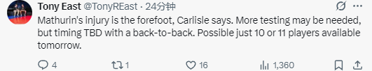 2025-10-26 11:30北京时间10月26日,NBA常规赛继续进行,步行者队103-128不敌灰熊队。赛后,步行者队主教练卡莱尔接受媒体采访,谈到了马瑟林的伤病情况。本场比赛进行到第三节,在灰熊队罚球时,马瑟林直接下场返回更衣室,随后步行者队官方宣布,他因右脚酸痛退出比赛。