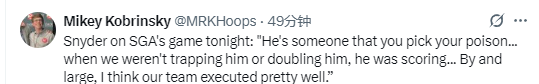 在谈到亚历山大的表现时,斯奈德说道:“他是那种让你‘左右为难’的球员,当我们不采用包夹或双人夹击战术时,他就能轻松得分,当我们夹击时,他又能将球传给队友。总的来说,我认为我们球队的战术其实执行得不错了。”