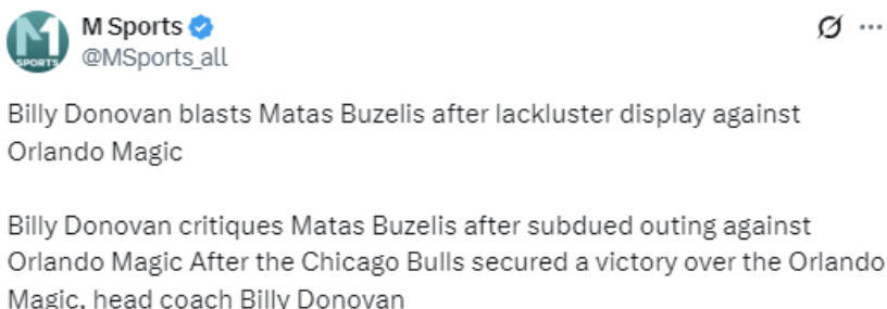 2025-10-26 12:20北京时间10月26日,NBA常规赛继续进行,公牛队110-98击败魔术队。虽然比赛获胜,但公牛队主教练多诺万还是在赛后批评了布泽利斯的表现。