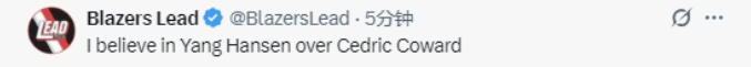 2025-10-26 13:40北京时间10月26日,开拓者队媒体Blazers Lead发帖,谈到了中国球员杨瀚森,表示他看好杨瀚森会打出比灰熊队新秀考沃德更好的表现。