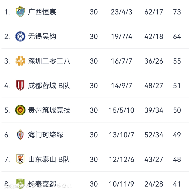 积分方面,本赛季分数最高的球队是广西恒宸(73分),分数最低的是广西蓝航(8分)。值得一提的是,广西蓝航也是本赛季中乙唯一零胜绩的球队。