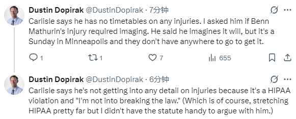 卡莱尔还称,他不会透露任何伤病细节,因为这会违反《健康保险流通与责任法案》(HIPAA),“我可不想违法”。