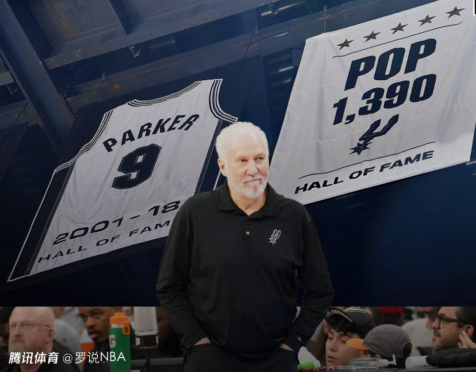 没有盛大的仪式,球迷们抬头望向弗罗斯特银行中心的球馆穹顶,只见一面简约的白色横幅,上面写着“波波1390”,以此致敬他创下的NBA教练生涯胜场纪录。横幅除印有马刺队徽外,顶部还有五颗星,代表波波维奇为这支曾一度战绩低迷的球队带来的5次总冠军;横幅底部则印有“名人堂”字样,以纪念他在2023年入选篮球名人堂。