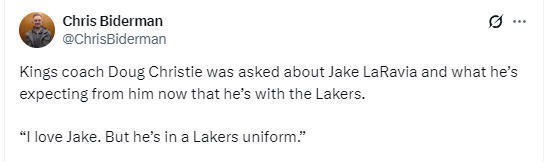 在谈到拉拉维亚的回归时,克里斯蒂说道:“我爱拉拉维亚,但他现在可穿的是湖人队的球衣啊,这就够了。”