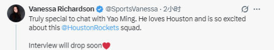 2025-10-27 08:20北京时间10月27日,火箭队记者Vanessa Richardson更新个人推特,晒出了一张与火箭名宿姚明的合影。
