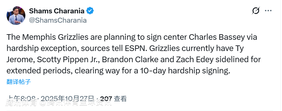 2025-10-27 08:30北京时间10月27日,据ESPN名记Shams报道,灰熊队计划通过困难特例签下中锋查尔斯-巴锡。目前灰熊队已有杰罗姆、小斯科蒂-皮蓬、布兰登-克拉克和扎克-伊迪多名球员长期缺阵,这为10天困难特例签约创造了条件。