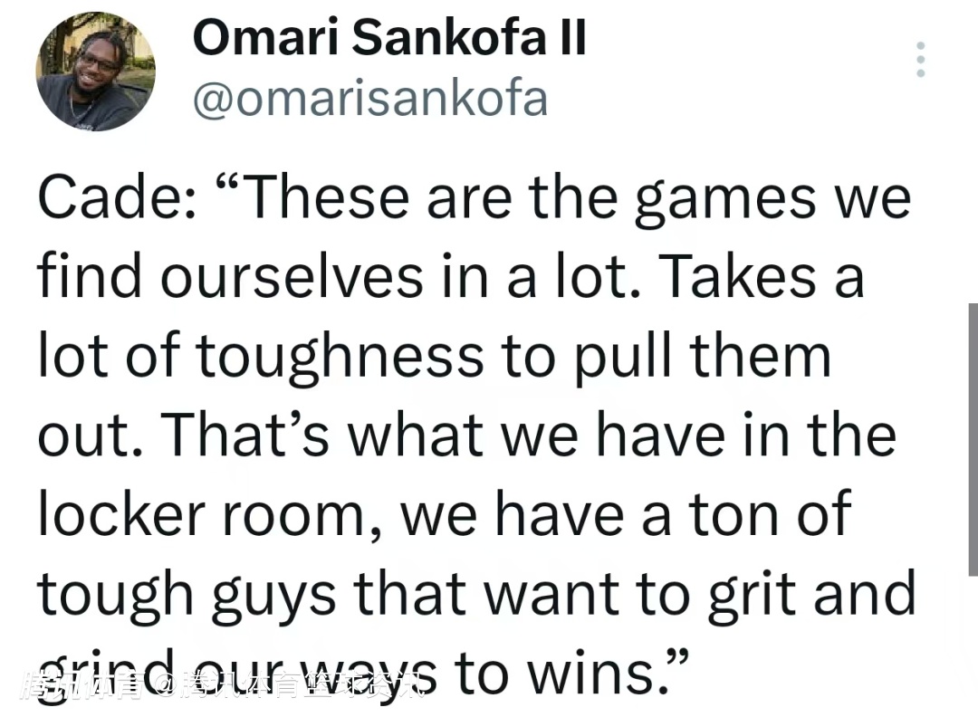 坎宁安补充道:“我们经常遇到这类艰难的比赛,要拿下胜利需要极强的韧性。而我们更衣室里就有这种特质,队里有很多坚韧的家伙,都愿意靠着拼劲和坚持去争取胜利。”