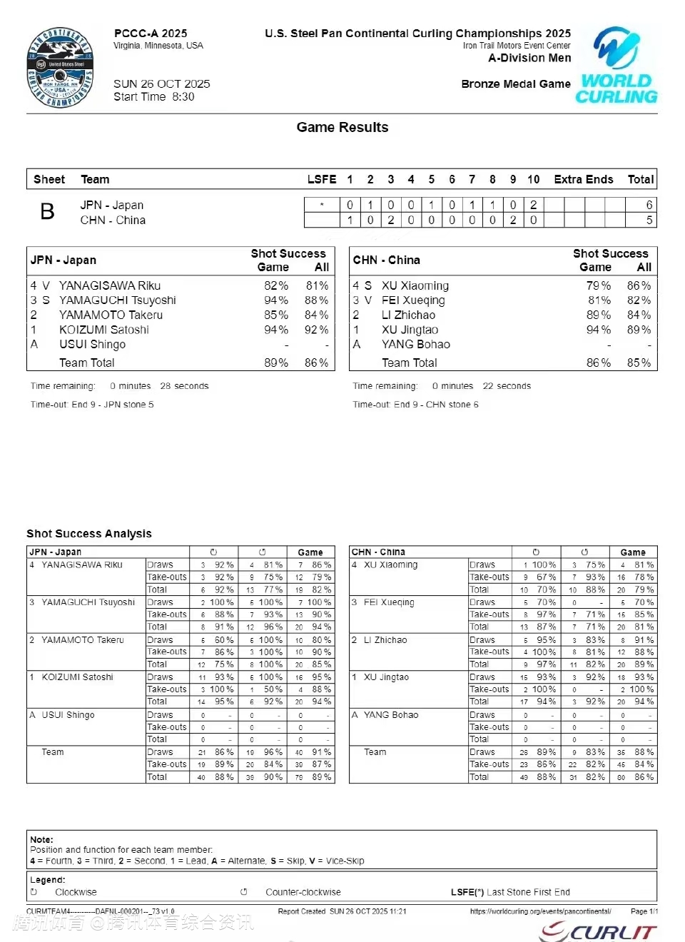 泛洲际冰壶赛铜牌战:中国男队5-6惜败日本 最终获得第四名