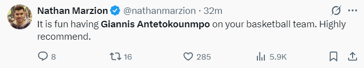 雄鹿记者Nathan Marzion:有扬尼斯-阿德托昆博这样的球星在队伍里实在是太幸福了。