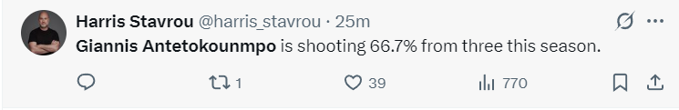 NBA记者哈里森:扬尼斯本赛季的三分球命中率高达66.7%.