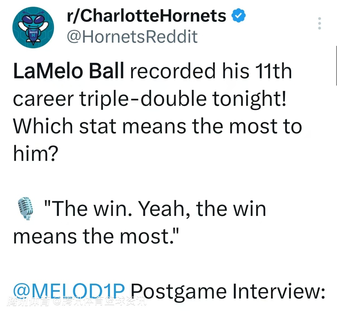 2025-10-27 09:50北京时间10月27日,NBA常规赛继续进行,黄蜂139-113大胜奇才。本场比赛,黄蜂队球星拉梅洛-鲍尔出场34分钟,投篮25中13,其中三分球12中5,得到38分13篮板13助攻3抢断。赛后,他在场边接受采访。