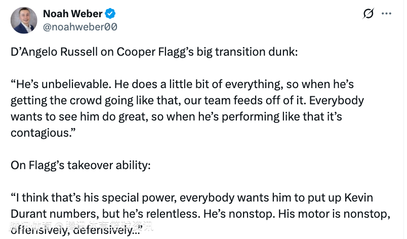 谈及弗拉格那次精彩的转换进攻扣篮,拉塞尔表示:“他太不可思议了,什么都会一点。所以当他像那样点燃现场观众时,我们全队都会被带动起来。每个人都希望看到他表现出色,所以当他打出那种表现时,这种势头是会传染的。”