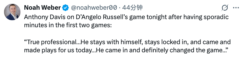 戴维斯谈及拉塞尔在头两场比赛出场时间不稳定的情况下,今晚迎来爆发时表示:“他是真正的职业球员。他始终专注于自己,保持投入,今天为我们创造了很多机会,他的登场无疑改变了比赛走势。”此役拉塞尔替补出战29分钟,投篮18中8,拿到24分5篮板6助攻。