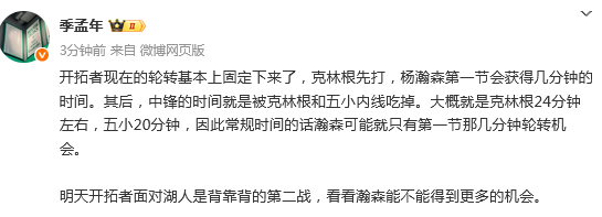 小杨的面前有克林根、有教练想打的五小阵容,再加上自身的能力、经验等问题,这确实是他要面对的现实。其实今天克林根的上场时间也不够连续,不过他做得好的地方是,篮板保护(尤其前场篮板)、外线投射(最近三场都有三分进账),这也是给小杨做出了好的示范。
