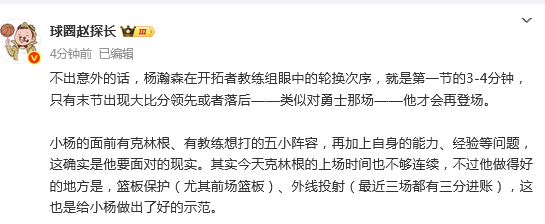 不出意外的话,杨瀚森在开拓者教练组眼中的轮换次序,就是第一节的3-4分钟,只有末节出现大比分领先或者落后——类似对勇士那场——他才会再登场。