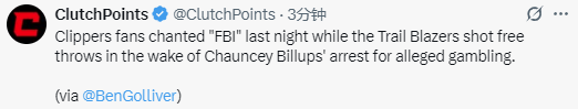 2025-10-27 23:40北京时间10月27日,快船队在NBA常规赛中114-107击败开拓者队,而在本场比赛期间,快船队球迷想出了一个独特招数干扰开拓者球员的罚球——每当开拓者球员站上罚球线,快船球迷就会高喊“FBI”。