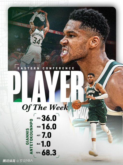 字母哥上周带领密尔沃基雄鹿队取得2胜1负的战绩,交出了极具统治力的数据单,个人场均得到36.0分、16.0个篮板、7.0次助攻和1.0次盖帽,三项命中率分别为68.3%、66.7%、62.9%。字母哥成为NBA历史上首位在赛季前3场比赛中,至少得到100分、40个篮板和15次助攻的球员。