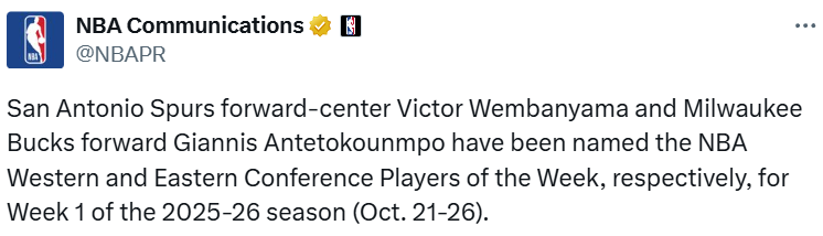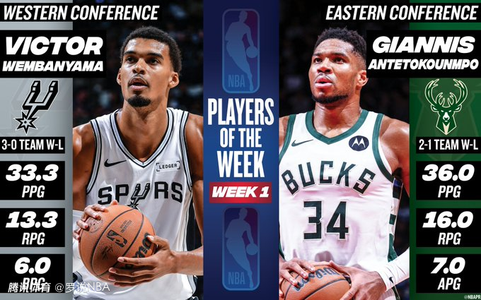 NBA官宣首周最佳:文班字母创纪录当选 东契奇亚历山大40+无缘