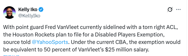 火箭计划申请伤病特例!金额可达1250万美元 范弗利特预计赛季报销