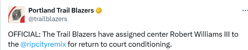2025-10-28 05:50北京时间10月28日,开拓者官方宣布,已将中锋罗伯特-威廉姆斯三世下放到其发展联盟附属球队,以进行重返赛场的体能调整。这意味着罗威已经接近复出,对于本来场均上场时间就很少的杨瀚森而言,这一消息可能意味着他更没机会出场了。