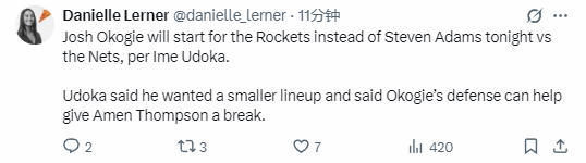 2025-10-28 06:40北京时间10月28日,NBA常规赛继续进行,火箭队对阵篮网队。赛前,火箭队主教练乌度卡透露,球队将变更首发阵容,奥科吉顶替亚当斯出任首发。