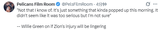 2025-10-28 07:00北京时间10月28日,NBA常规赛继续进行,鹈鹕队对阵凯尔特人队。赛前,鹈鹕队主教练威利-格林接受媒体采访,谈到了锡安的伤情。