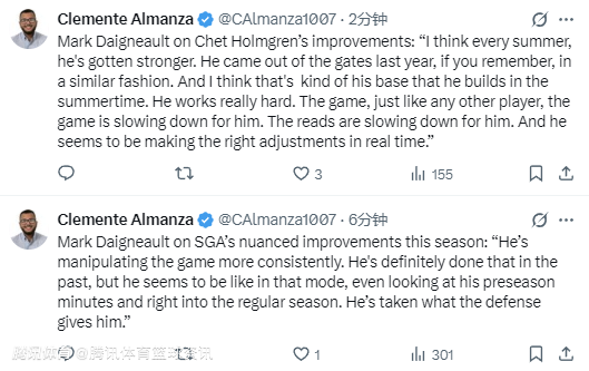 戴格诺特说道:“亚历山大对比赛的掌控力变得更加稳定了。过去他当然也有这样的表现,但现在他似乎已经完全进入了这种状态,无论是季前赛的登场时间,还是到常规赛开局阶段,都能看出来。他很清楚如何利用防守端给的机会去得分。”