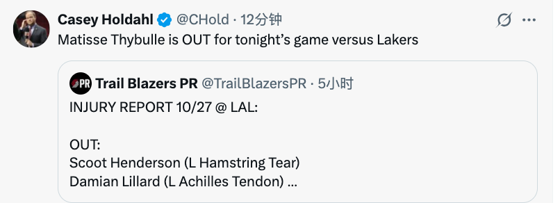 2025-10-28 09:30北京时间10月28日,NBA常规赛继续进行,开拓者将在10点30分客场挑战湖人,赛前开拓者官方更新了本场比赛的伤病报告,此前出战成疑的塞布尔确定缺席,算上此前确定缺席的三人(亨德森、利拉德、罗威),本场比赛开拓者将有4人缺席。