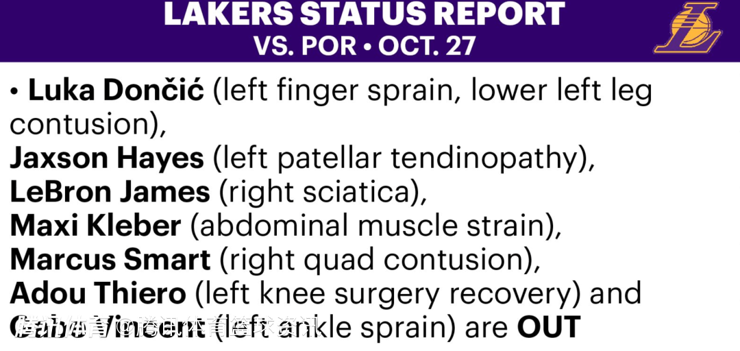 湖人这边,东契奇、海斯、詹姆斯、克勒贝尔、斯马特、蒂耶罗、文森特也因各自的伤病原因缺席本场比赛。