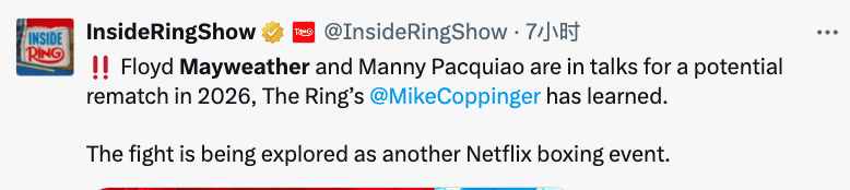 2025-10-28 09:30北京时间10月28日,根据多家外媒报道,梅威瑟和帕奎奥正在进行深入交流,双方希望在2026年上演一场比赛。梅威瑟和帕奎奥曾在2015年上演世纪大战,最终梅威瑟凭借点数优势获得胜利。