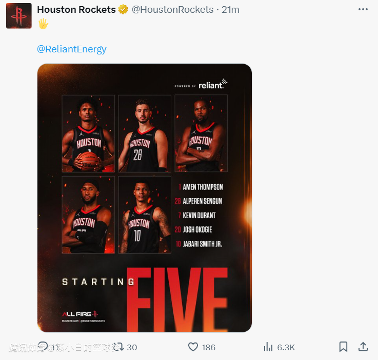 火箭:奥科吉、阿门、杜兰特、史密斯、申京;