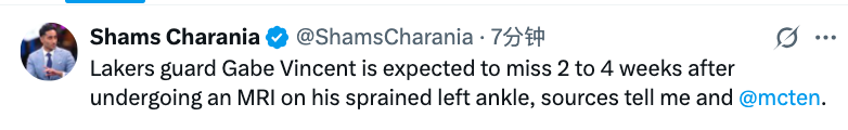 2025-10-28 11:10北京时间10月28日,据名记Shams报道,湖人后卫文森特在对其左脚踝扭伤进行核磁共振检查后,预计将缺阵2至4周。