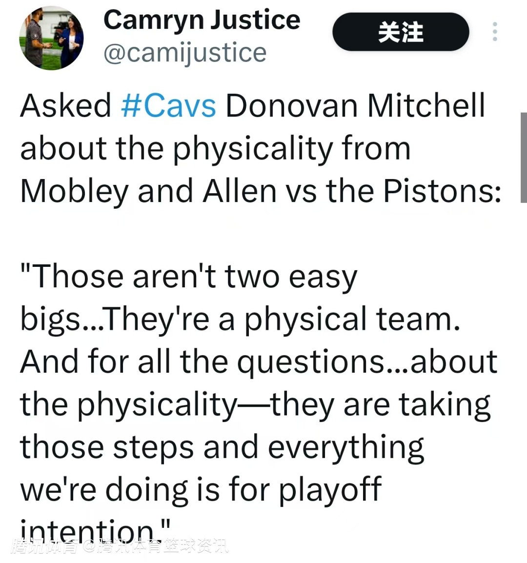 当被问及如何看待莫布利和艾伦在对阵活塞队时展现出的对抗强度时,米切尔表示:“对手的两个大个子可不好对付,活塞队是一支对抗很强的队伍。我们会回应所有关于对抗强度的质疑,他俩正在取得进步,我们所做的一切都是为了季后赛。”