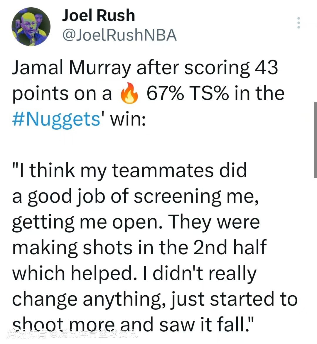 本场比赛,穆雷的真实投篮命中率高达67%。他表示: “我觉得队友们为我做掩护、创造空位的工作做得很好。他们在下半场投进了不少球,帮了大忙。我其实没做什么调整,就是出手次数多了些,而且球也进了。”