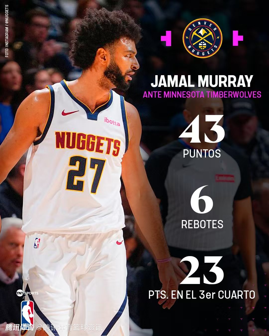 2025-10-28 12:50北京时间10月28日,NBA常规赛继续进行,掘金以127-114战胜森林狼。本场比赛中,掘金球员贾马尔-穆雷出战37分钟,29投16中,其中三分球9投5中,罚球7投6中,得到43分6篮板3助攻。赛后,他接受媒体采访。