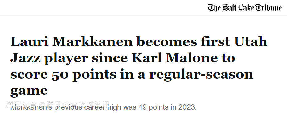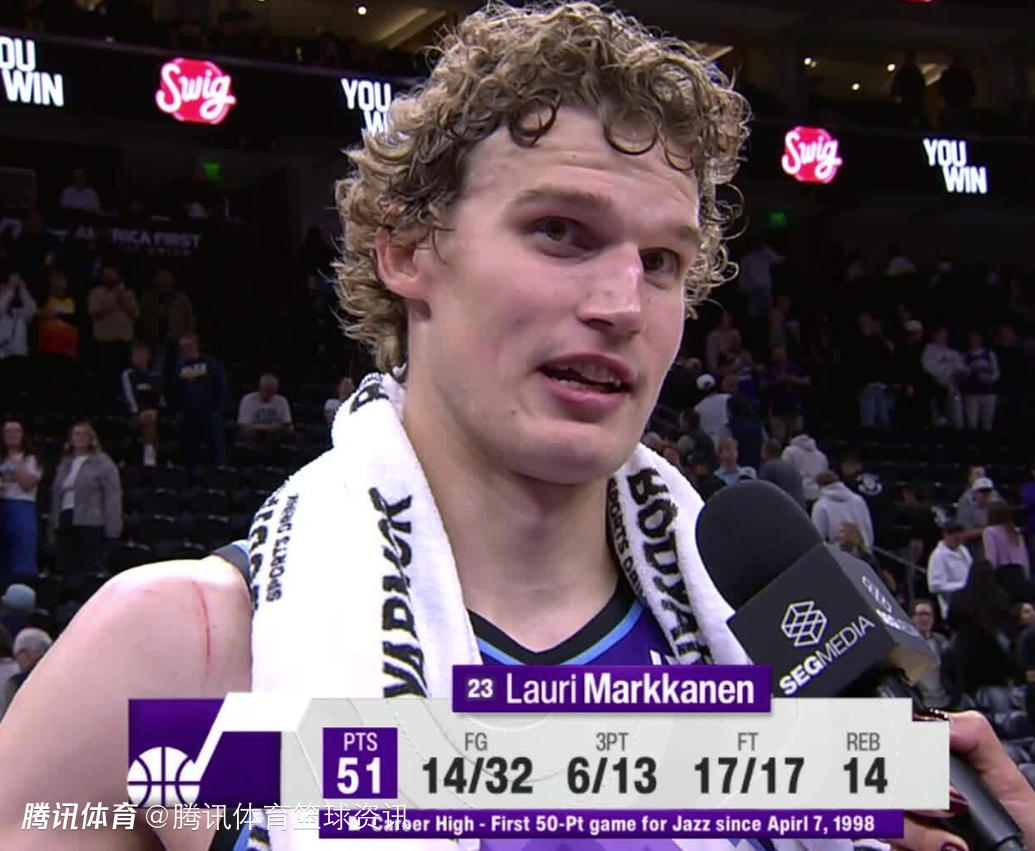 2025-10-28 13:10北京时间10月28日,NBA常规赛继续进行,爵士队通过加时赛138-134击败太阳队。马尔卡宁此役出战45分钟,32投14中(三分球13中6,罚球17中17)砍下51分14篮板3助攻。这是卡尔-马龙1998年面对勇士队砍下56分以来,首次有爵士队球员在常规赛单场砍下50+(米切尔曾两次做到过这点,但都是在季后赛)。赛后,马尔卡宁接受媒体采访。