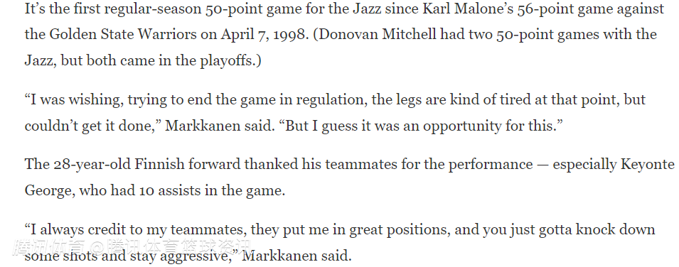 马尔卡宁还在赛后感谢了自己的队友们,尤其是本场比赛送出10次助攻的基扬特-乔治。他说道:“我一直觉得功劳要归给队友,是他们为我创造了绝佳的进攻机会,而我要做的就是把该进的球投进,同时保持进攻侵略性。”